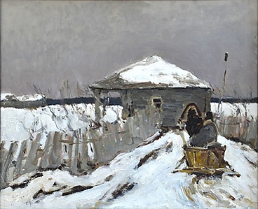 В центре композиции изображён сельский дом с заснеженной крышей, к которому ведёт покосившаяся изгородь. К дому подъезжает тёмная лошадь, запряжённая в сани, в которых спиной к зрителю сидит мужчина в тулупе. За изгородью расположены голые кусты и скворечник на длинном шесте. На дальнем плане простирается заснеженное поле, по горизонту виднеется тёмный лес, а слева находятся два небольших домика. Небо выполнено в тёмно-серых тонах, подчёркивая зимнюю атмосферу пейзажа.