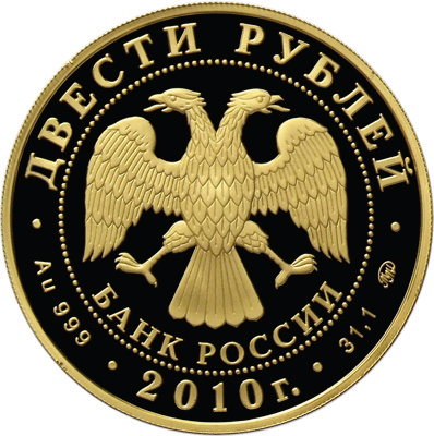 В центре — эмблема Банка России (двуглавый орёл с опущенными крыльями, под ним — надпись полукругом «БАНК РОССИИ»), обрамленная кругом из точек и надписями по кругу — вверху: «ДВЕСТИ РУБЛЕЙ», внизу: слева — обозначения драгоценного металла и пробы сплава, в центре — дата выпуска «2010 г.», справа — содержание химически чистого металла и товарный знак монетного двора. | Единый аверс для всех монет данной серии 2010 года (с точностью до значка монетного двора, соответственно).