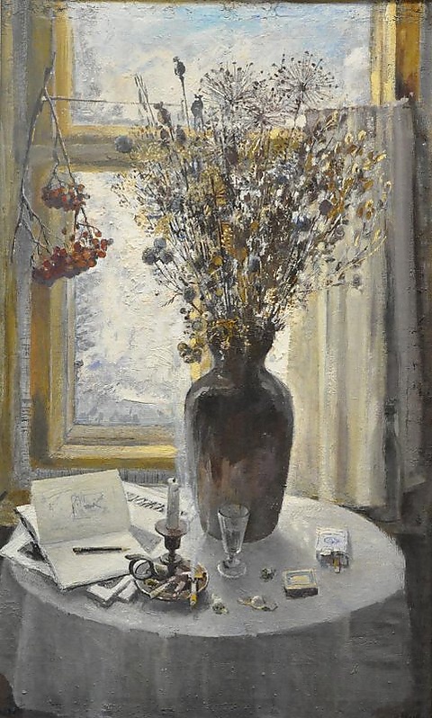 В центре композиции натюрморта находится круглый стол, покрытый белой скатертью. На столе размещена высокая ваза с букетом из сухих цветов. Слева от вазы лежит газета, на которой расположена раскрытая тетрадь с карандашом, справа — раскрытая пачка сигарет и спички. На переднем плане перед вазой стоит металлический подсвечник с ручкой и свечой, в котором лежат окурки и дымящаяся сигарета. Рядом находится наполовину наполненная рюмка и несколько мелких неопределённых предметов. Фоном служит замёрзшее окно, сквозь которое проходит мягкий дневной свет. Слева на окне изображена гроздь ягод рябины, справа — белая занавеска.
