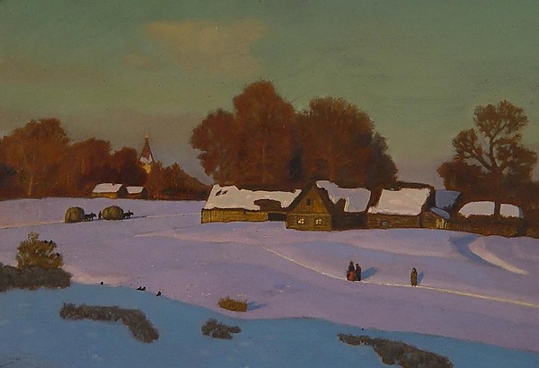 На полотне представлен зимний вечерний пейзаж деревни. Передний план занимает узкая полоса голубой тени с тёмными участками земли. На втором плане изображена снежная светло-фиолетовая равнина, по диагонали которой проходит тропинка с фигурами людей. Справа расположены дома и высокие деревья, слева — просёлочная дорога, по которой движутся две лошади с возами сена. За ними видны два домика, полоса деревьев и остроконечная башня, возвышающаяся за кронами. Особое внимание привлекает зелёный цвет неба, подчёркивающий атмосферу зимнего вечера.
