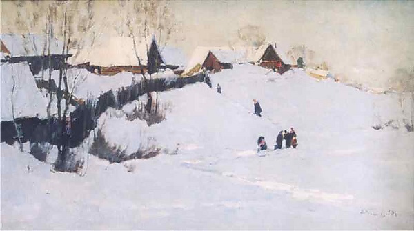 На полотне изображён высокий заснеженный берег реки, на котором расположены деревенские дома с покрытыми снегом крышами: в тени они выполнены в серо-голубых оттенках, а на солнце — в бело-розовых тонах. Слева по диагонали к реке спускается забор, перед которым находятся тонкие деревья и коричнево-серые кустарники. На поверхности реки правее центра изображена группа женщин с вёдрами и ребёнок; выше по склону заметны поднимающиеся фигуры. Справа на понижении склона также видны тонкие деревья. Небо написано в светло-зелёной гамме, справа у горизонта выделяется розовое облако.