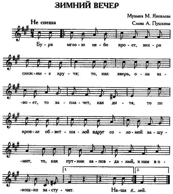 Александр Пушкин написал стихотворение «Зимний вечер» в 1825 году. В 1830-м оно был опубликовано, и спустя 2 года, в 1832 году, его товарищ по лицею Михаил Яковлев положил стихотворение на музыку[1]. Кем впервые было исполнено произведение, неизвестно, однако оно довольно быстро вошло в перечень востребованных салонных романсов.