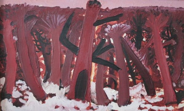 В композиции пейзажа на переднем плане среди белых сугробов изображены высокие деревья с массивными стволами и без кроны. Основные оттенки стволов и ветвей — красный, бордовый, чёрный и фиолетовый, что придаёт работе выразительную цветовую гамму. Между деревьями видны жёлтые просветы, а небо написано ровным розовым тоном, подчёркивая безоблачную атмосферу сцены.