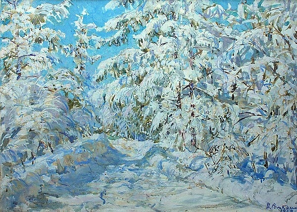 На картине изображена заснеженная дорога, уходящая в глубину и освещённая солнцем, что создаёт перспективу композиции. По обеим сторонам дороги расположены раскидистые ели, покрытые плотным слоем снега с бело-голубыми и сиреневыми оттенками. На фоне картины выделяется светло-голубое небо. В работе преобладают голубые и охристые тени, что формирует характерную для зимнего пейзажа цветовую гамму.