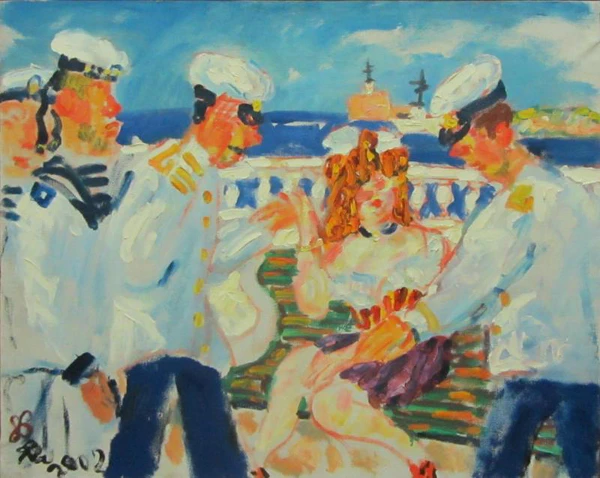 На картине изображены четыре моряка в форме и женщина с рыжими кудрявыми волосами, которые сидят в прогулочном катере под названием "Зинаида". Все фигуры держат в руках бокалы, что подчёркивает атмосферу отдыха и неформального общения, характерную для бытового жанра.
