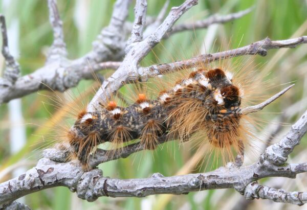 Гусеницы длиной примерно от 35 до 40 мм, серо-чёрного цвета, с бело-красным рисунком и длинным волосяным покровом. Они питаются чаще лиственными деревьями, такими как дуб, вишня, слива, яблоня и груша.