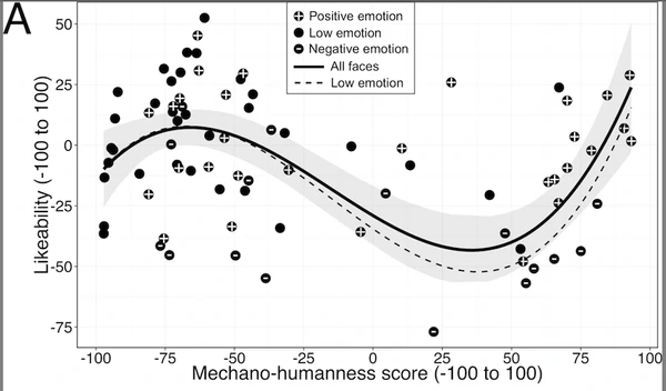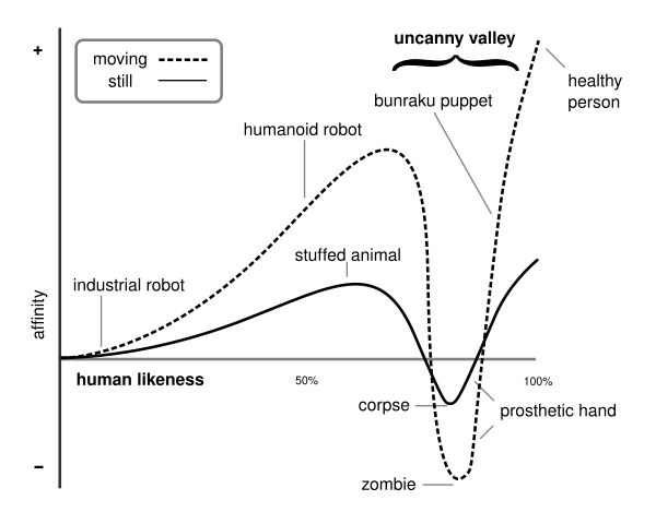 Интервал негативной реакции между «слегка» и «полностью» человеческим обликом и есть эффект зловещей долины. Почти человеческий робот кажется некоторым людям слишком «странным», вызывает чувство зловещести и не провоцирует необходимой эмпатии для продуктивного взаимодействия[7].