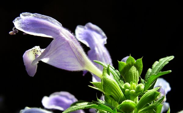 Цветки бледно-фиолетовые, на коротких цветоножках в шестицветковых ложных мутовках. Чашечка коротковолосистая, двугубая; венчик длиной 20—25 мм, белый или голубовато-фиолетовый, снаружи опушенный.
