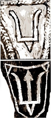 Двузубые и трезубые тамги известны в VIII—IX вв. в хазарском мире на деталях поясной гарнитуры (Подгоровский могильник), в виде граффити на каменных блоках и кирпичах крепостей (Саркел, Маяцкое, Семикаракорское, Хумаринское городища), в виде гончарных клейм на сосудах (Дмитриевский могильник). Возможно в древнерусскую среду такие знаки попали именно из Хазарии, как и титул «каган», воспринятый первыми русскими князьями[11][12].