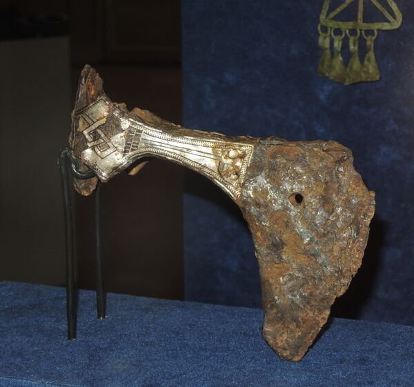 Другим моментом, сближающим эмблемы древнерусских князей с гербами боспорских царей, является наследственный характер их развития. Как уже было сказано выше, княжеские «гербы» Древней Руси были личными знаками, не передававшимися по наследству, но, как и символы Боспорского царства, имевшими единую базу в виде двузубца, к которому каждый правитель добавлял (или из которых изымал) элементы в виде разного рода «отростков», завитков и т. п. В Бодзе (Польша) в богатой могиле воина (погребение E864/I) на бронзовом наконечнике пояса обнаружен двузубец с крестовидной фигурой на правом зубце и волютообразной фигурой ниже треугольной ножки[8]. На двузубце из камерного погребения № 6 на Старовознесенском некрополе Пскова между двумя зубцами помещён ключ[9].