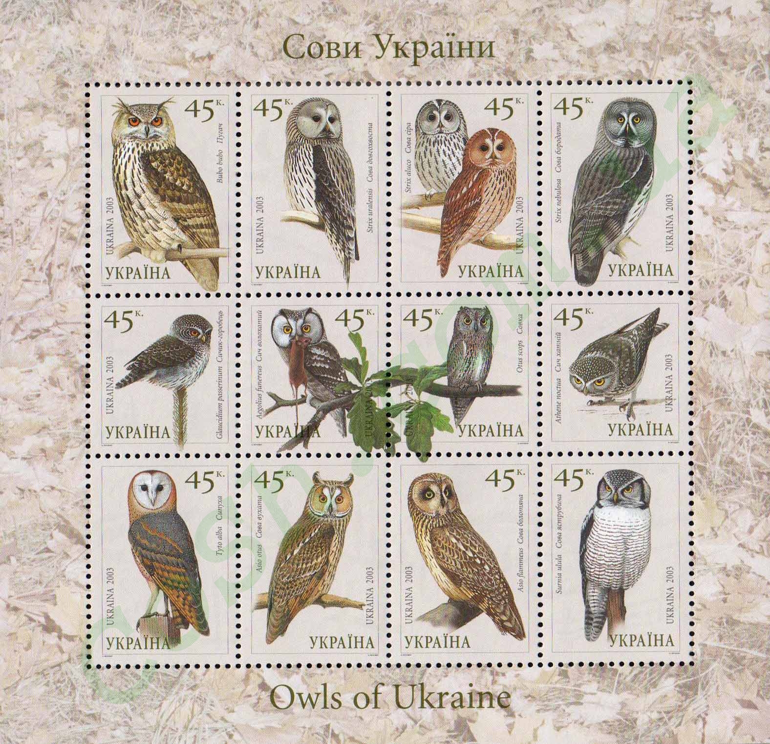 Малий поштовий аркуш «Сови України»: Пугач; Сова довгохвоста; Сова сіра; Сова бородата; Сичик-горобець; Сич волохатий; Совка; Сич хатній; Сипуха; Сова вухата; Сова болотяна; Сова яструбина. с укр. — «Малый почтовый лист „Совы Украины“: