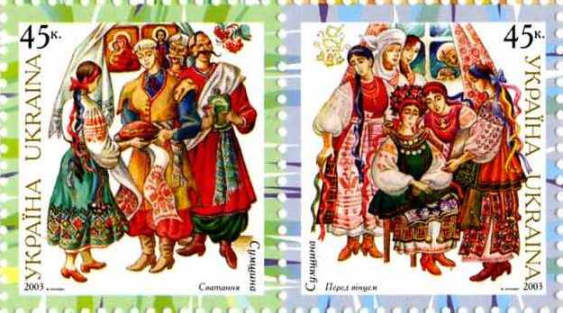 Зчіпка «Український народний одяг. Сумщина»: Сватання; Перед вінцем. с укр. — «Сцепка „Украинский народный костюм: Сумщина“: |