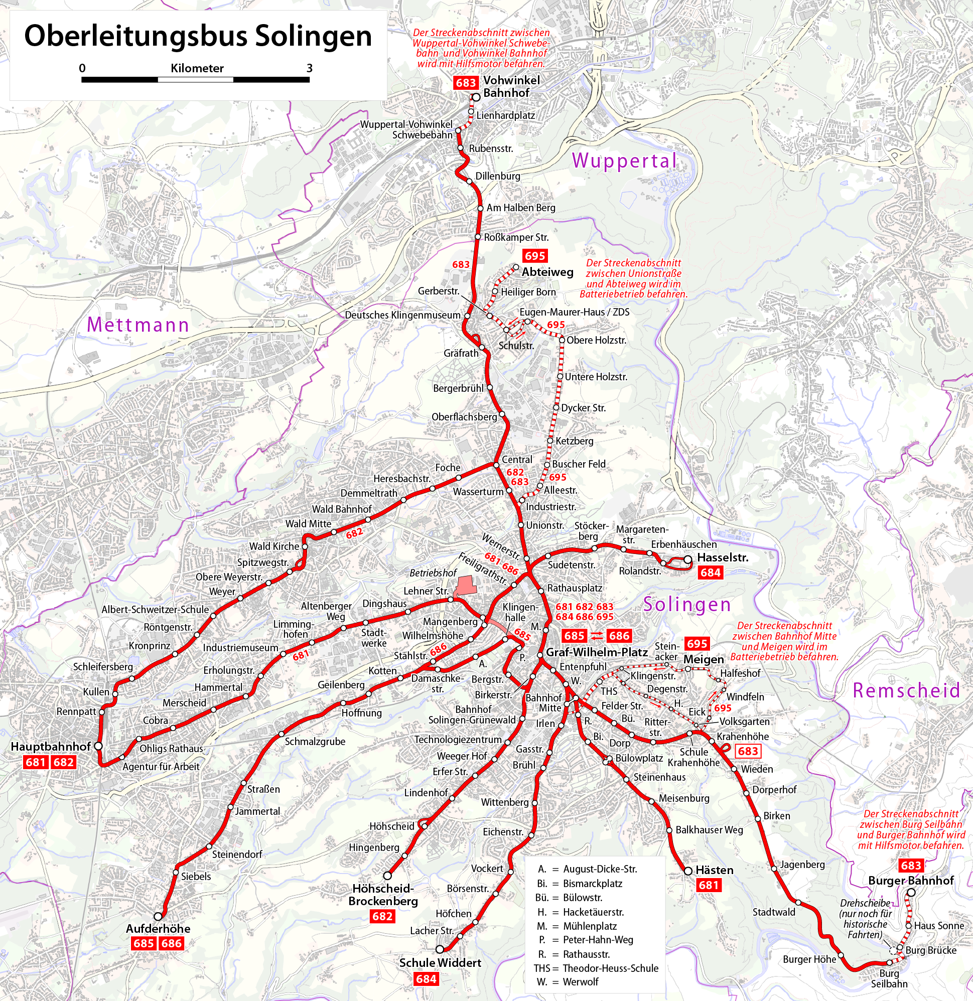 Крупнейшим пересадочным узлом в Золингене является площадь Графа Вильгельма (Graf-Wilhelm-Platz), через которую походят все 7 маршрутов. Троллейбусы работают по тактовому расписанию, минимальный интервал в рабочие дни — 10 мин. — установлен для маршрутов № 681 и 682, образующих кольцо между главным вокзалом и центром города. Маршрут № 683 работает с 10-минутным интервалом только от вокзала Wuppertal-Vohwinkel до кольца Krahenhöhe, а на продолжении маршрута в Бург интервал составляет 30 мин.