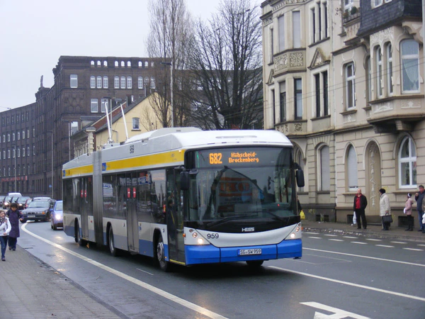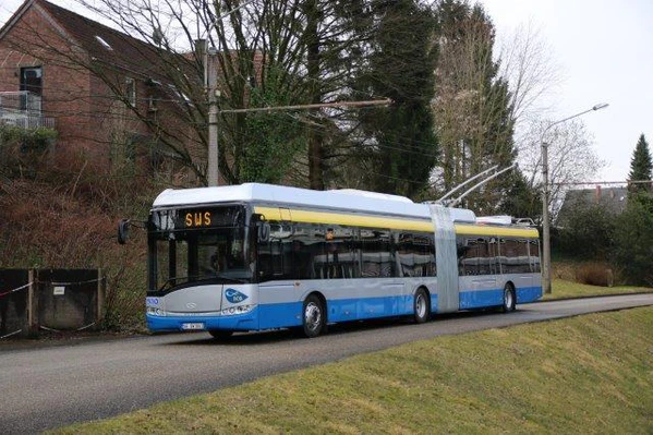 В 2018 году в Золинген поступили 12 польских троллейбусов Solaris Trollino 18 с увеличенным автономным ходом от аккумуляторных батарей. 31 октября 2019 года машины, обозначенные аббревиатурой BOB (нем. Batterie-Oberleitungs-Busse), вышли на бывший автобусный маршрут № 695, лишь 20 % которого проходит под контактной сетью. Согласно расчётам местных специалистов, замена дизельных автобусов на аккумуляторные троллейбусы на этом маршруте позволяет экономить до 147 000 л дизельного топлива в год, и в перспективе возможно дальнейшее сокращение эксплуатации автобусов в пользу современного электротранспорта[3][4]. В конце 2021 года троллейбусный парк Золингена пополнился двухосными 12-метровыми троллейбусами Solaris Trollino 12.