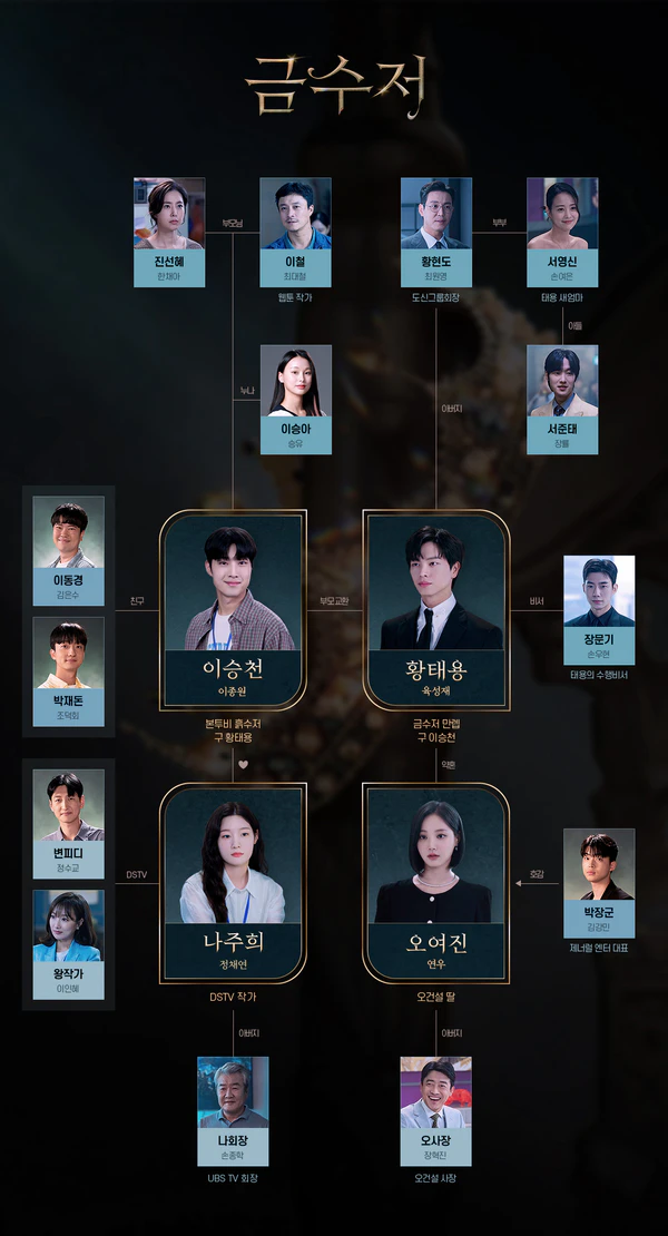 - Ли Чон Вон в роли Хван Тэ Ёна — вопреки мнению главного героя о нём, обычный старшеклассник, жил под давлением своего отца, проверками своей мачехи и травмой прошлого. Тэ Ён больше привязан к своей умершей матери, чем к деньгам, и хорошо адаптировался к изменившейся жизни. После всех травмирующих событий самостоятельно пробивает себе дорогу к славе и безбедной жизни любимым делом[15].