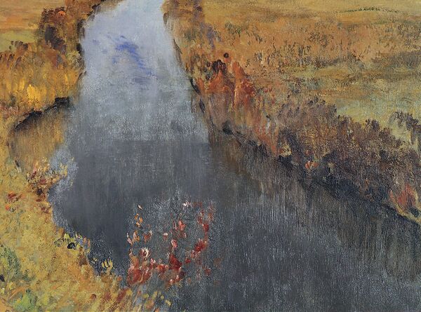 Следуя вдоль речных берегов, взгляд зрителя пересекает широкие луга с перелесками по обеим сторонам реки, а затем уходит к изображённым вдали лесам. На правом (с точки зрения зрителя) берегу реки выделяется одинокая стройная золотисто-жёлтая берёзка[14], правее неё находится перелесок с зелёной листвой[58]. Вдали речка уходит влево и теряется за поворотом[14]. Изгиб реки оживляет композиционное построение полотна, внося в него элемент живой «случайности»[58]. У опушки дальнего леса — там, где рельеф местности немного поднимается — изображены зелёные поля с озимыми посевами и несколько деревенских домов. По мере удаления в глубину звучность колорита постепенно смягчается и переходит в более спокойную цветовую гамму[14].