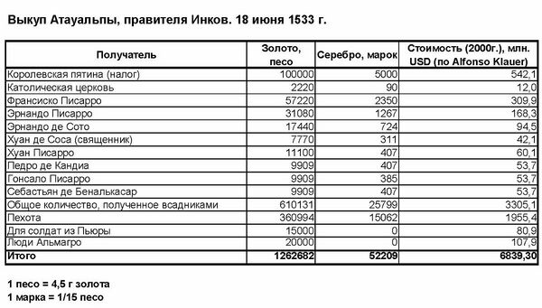 …с 1548 по 1551 год пятая королевская часть (налог) оценивалась в сумму больше 3 миллионов дукатов [1 золотой дукат весил 3,6 г = 11 королевским кастельяно = 375 мараведи; с 1552 и в XVII веке были уже серебряные дукаты], что стоило больше, чем полученный от Атавальпы выкуп, и в городе Куско не было найдено столько, когда его обнаружили.