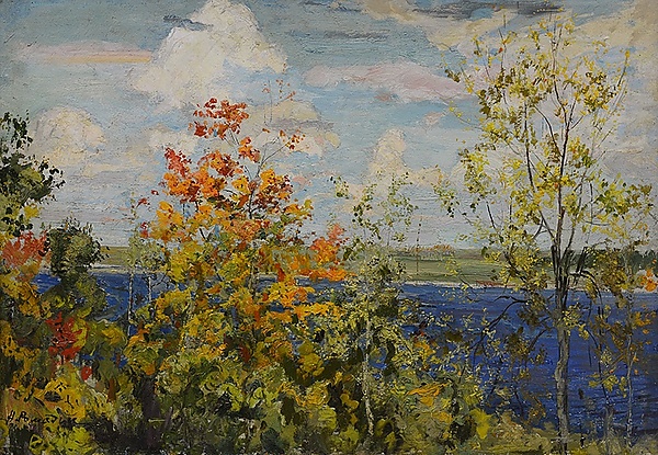 На полотне представлен осенний пейзаж с рекой. На переднем плане изображены небольшие деревья с тонкими ветвями и листвой буровато-зелёных, золотисто-оранжевых и красных оттенков, выполненной с помощью небольших круглящихся пастозных мазков. На втором плане располагается тёмно-синяя, спокойная река, за которой виден открытый зелёный берег. В верхней части композиции находится высокое ярко-голубое небо с объёмными розовыми и жёлтоватыми облаками.