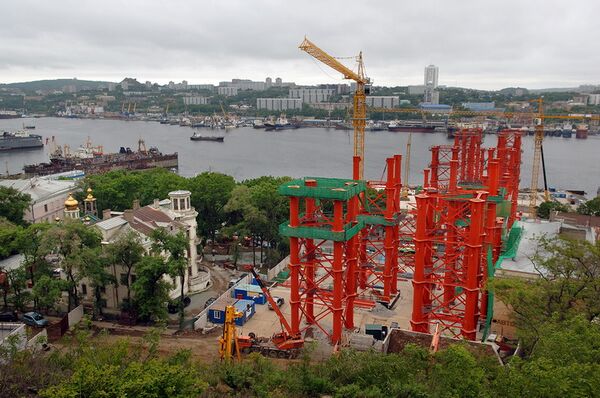 14 января 2010 года: первый пилон моста через бухту Золотой Рог во Владивостоке, который строится в районе 36 причала, достиг высоты 40 метров.