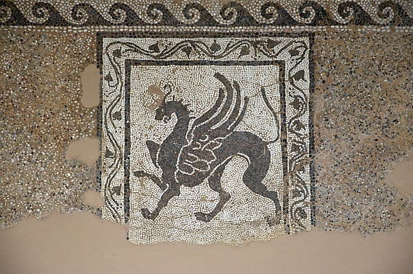 На реверсе — изображение крылатого грифона, что держит в клюве копье. Он толчет большой колос, олицетворявший в тот исторический период главное богатство края — хлеб. Крылатый грифон повернут головой влево, его правая нога поднята. Грифоны были магическими охранниками богатства, отсюда их устрашающий вид и несколько агрессивная поза. Грифон также геральдический символ Пантикапея.