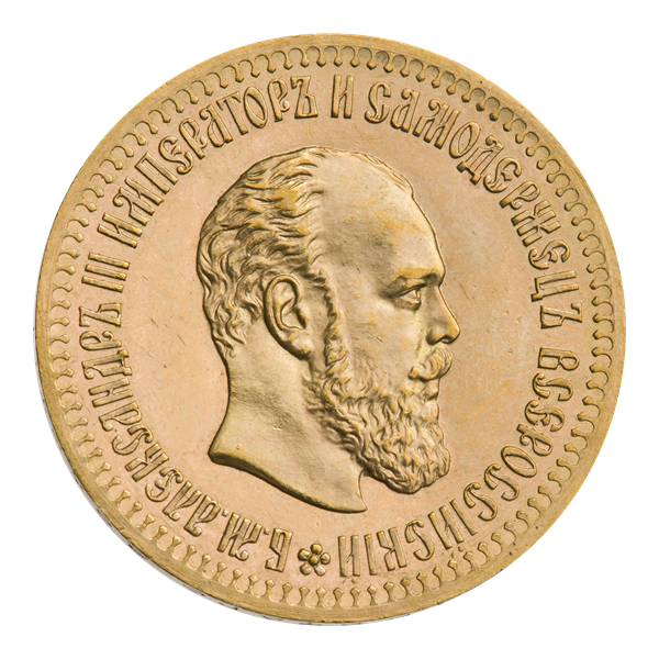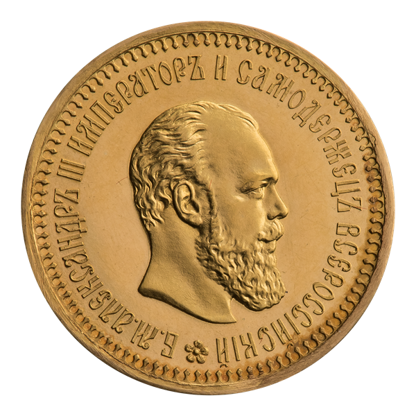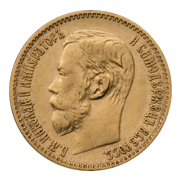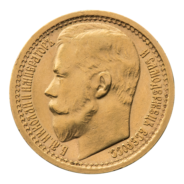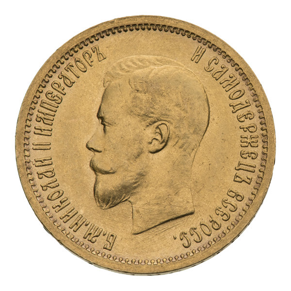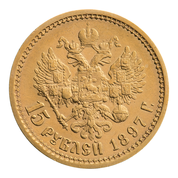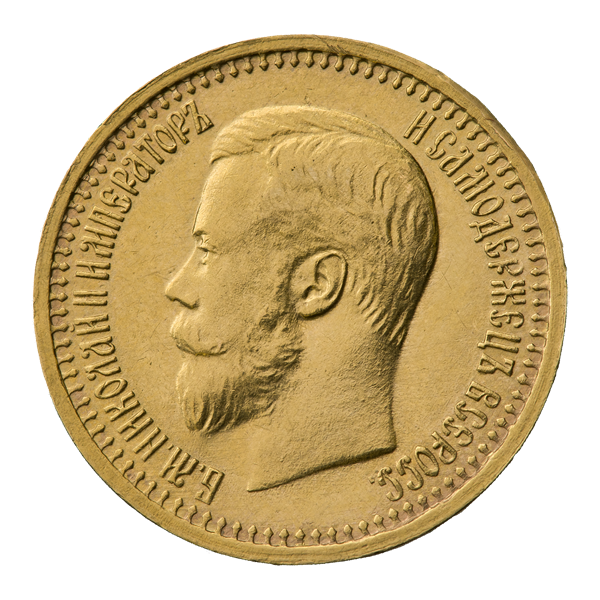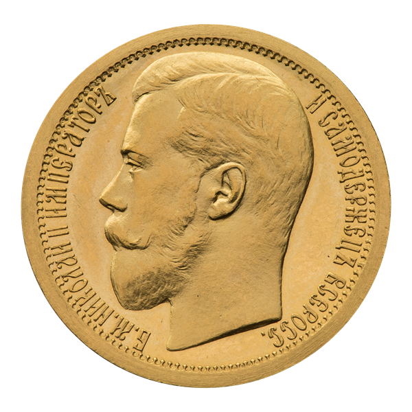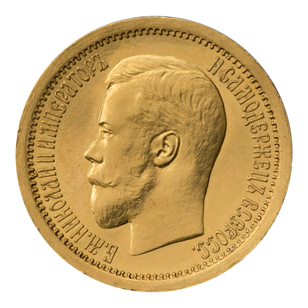 | Золотые монеты Николая II В начале его правления начинается денежная реформа под руководством министра финансов С. Ю. Витте, целью которой было создание единого курса монет всех металлов и бумажных денежных знаков, основанном на золотом стандарте. Ради этого стопа золотых монет была увеличена в полтора раза. Реформа была успешно завершена в 1897 — 1899 годах, в результате чего в обращение были введены золотые монеты двух новых номиналов в 15 и 7,5 рублей, а также 5 и 10 рублей повышенной стопы. С этим событием связано появление пробных золотых монет, предшествующих утверждённым типам.[89] | |||||||