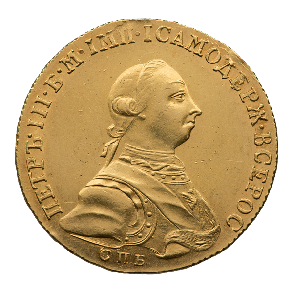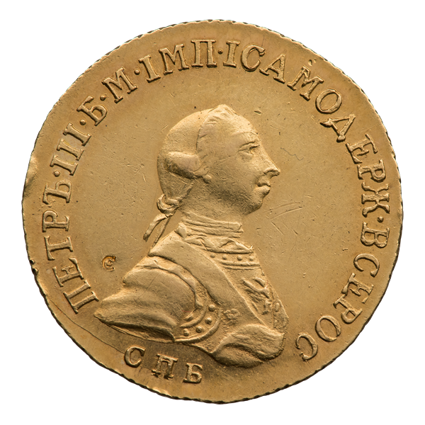 | Золотые монеты Петра III При нём впервые начинается чеканка на Санкт-Петербургском монетном дворе имитации нидерландского дуката, который до этого чеканился на Красном монетном дворе.[21] | |||||||