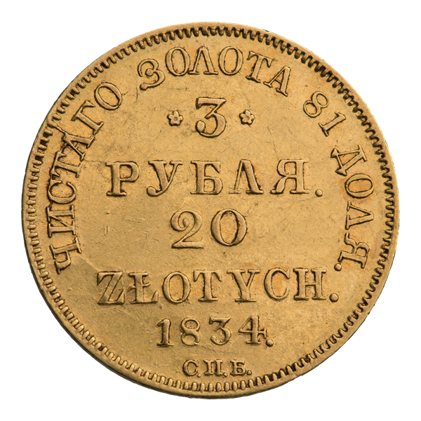 | 3 рубля — 20 злотых | 1834 — 1841 | Спецвыпуск Русско-польская монета с двойным обозначением номинала Аверс: |