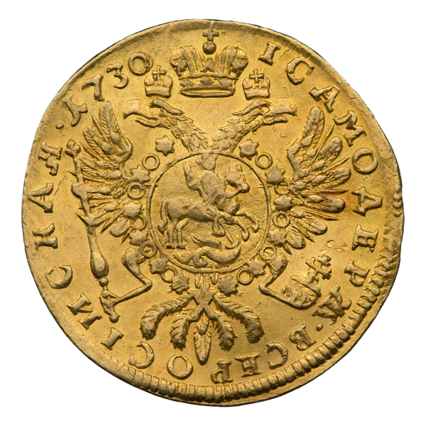 | Золотые монеты Анны Иоанновны В годы её царствования Кадашевский монетный двор был закрыт, но продолжил работу Красный монетный двор.[20] В 1735 году на нём начинается чеканка нидерландских дукатов. Идентифицировать данные монеты не представляется возможным ввиду отсутствия штемпелей и оттисков с них.[21] | |||||||
