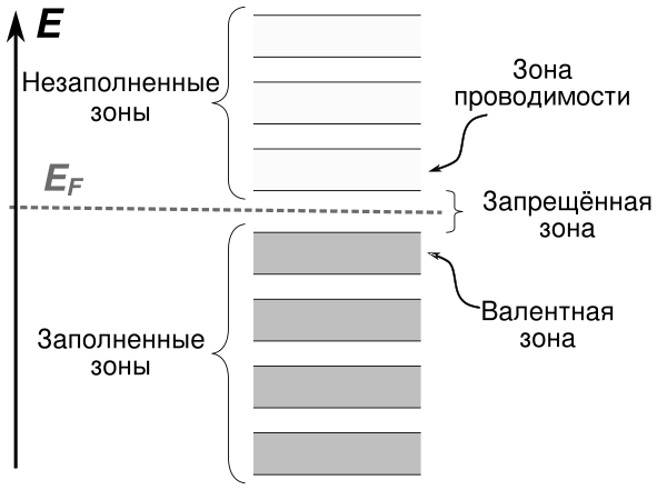 В полупроводниках и диэлектриках валентная зона и зона проводимости разделены запрещённой зоной, при нулевой температуре состояния в валентной зоне полностью заняты электронами, а в зоне проводимости электроны отсутствуют, поэтому при 0 К эти вещества не проводят электрический ток, так как для движения электронов под действием электрического поля необходимо изменение состояния электронов, а все состояния в валентной зоне заняты и электроны не могут изменить своё квантовомеханическое состояние.
