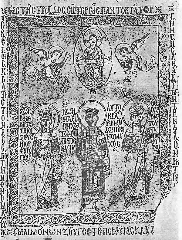 Первоначальный выбор Зои пал на Константина Даласина, которого её отец некогда прочил ей в мужья, но Константин выдвинул условия, наметил планы реформ и из-за этого неудобного для сестёр-соправительниц поведения был отвергнут и отправлен в провинцию[54]. Ещё один претендент — Константин Артоклин, бывший, если верить слухам, её любовником при жизни Романа III, скоропостижно скончался, не успев возложить на себя корону, хотя «все уже склонялись в его пользу»[55]. Молва винила в его смерти супругу, опасавшуюся, что вслед за Еленой, женой Романа III, её вынудят уйти в монастырь, чтобы освободить Константина для женитьбы на императрице[9]. Наконец Зоя остановилась на своём прежнем фаворите Константине из рода Мономахов.