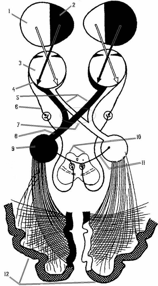 Бинокулярное зрение у человека, как и у других млекопитающих, а также птиц и рыб, обеспечивается наличием двух глаз, информация от которых обрабатывается сначала раздельно и параллельно, а затем синтезируется в мозгу в зрительный образ. У далёких филогенетических предшественников человека глаза были расположены латерально, их зрительные поля не перекрывались и каждый глаз был связан только с противоположным полушарием мозга — контралатерально. В процессе эволюции у некоторых позвоночных, в том числе и у предков человека в связи с приобретением стереоскопического зрения, глаза переместились вперёд. Это привело к перекрытию левого и правого зрительных полей и к появлению новых ипсилатеральных связей: левый глаз — левое полушарие, правый глаз — правое. Таким образом появилась возможность иметь в одном месте зрительную информацию от левого и правого глаза, для их сопоставления и измерения глубины.