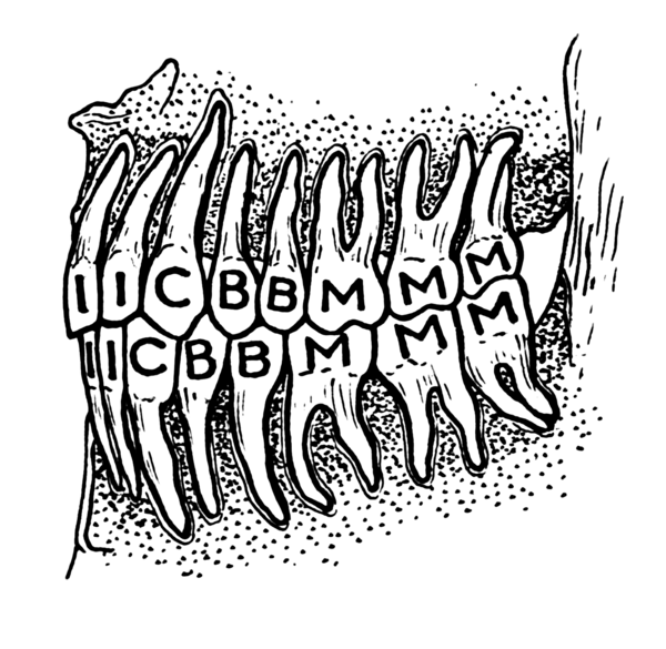 При записи зубной формулы используют сокращенные названия типов зубов гетеродонтной зубной системы: I (лат. dentes incisivi) — резцы; C (лат. d. canini) — клыки; P (лат. d. premolares) — предкоренные, или малые коренные, или премоляры; M (лат. d. molares) — коренные, или большие коренные, или моляры. За сокращенным названием типа зубов следует указание количества пар зубов данной группы: в числителе — верхней и в знаменателе — нижней челюсти.