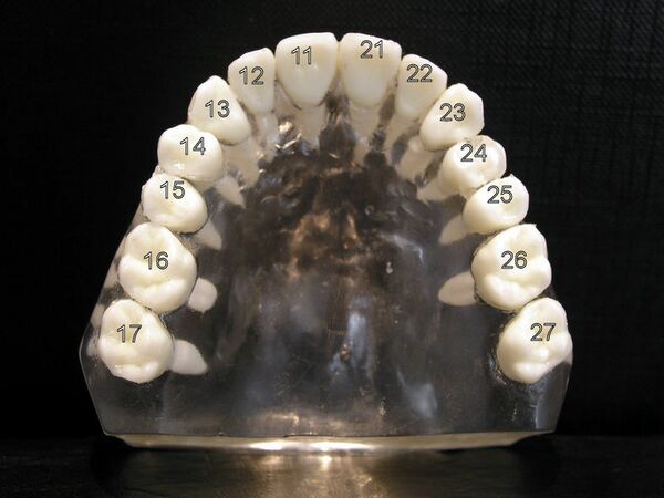 - Зубы верхней челюсти справа (соответственно центральный резец — 11, второй резец — 12, клык — 13, первый премоляр — 14, второй премоляр — 15, первый моляр — 16, второй моляр — 17, третий моляр или зуб мудрости − 18).