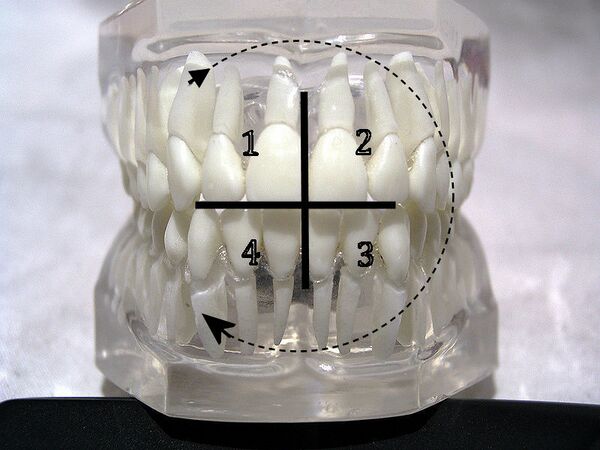 Все зубы разделяются на 4 сектора (против часовой стрелки, если смотреть изнутри):