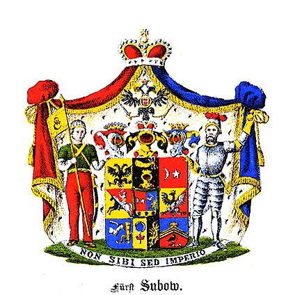 2 июня 1796 года граф Римской империи Платон Александрович Зубов возведён грамотой императора Франца II, с нисходящим его потомством, в княжеское Римской империи достоинство с титулом светлости. В том же году последовало высочайшее соизволение на принятие этого титула и пользование им в России. На щите герба Римской Империи князя Зубова, разделенном на восемь частей, посредине находится малый щиток, разрезанный горизонтально надвое. В его верхней части, в правом красном поле - серебряный полумесяц, рогами обращенный в правую сторону, и серебряная пятиугольная звезда. В левом голубом поле - рука в серебряных латах, держащая вверх поднятый меч; возле этой руки колчан с серебряными стрелами, поставленный внизу, на золотом луке. В нижней части - в золотом поле, три голубые лилии. Этот малый щиток, покрытый зеленым и серебряным наметом, имеет на поверхности увенчанный золотой шлем.