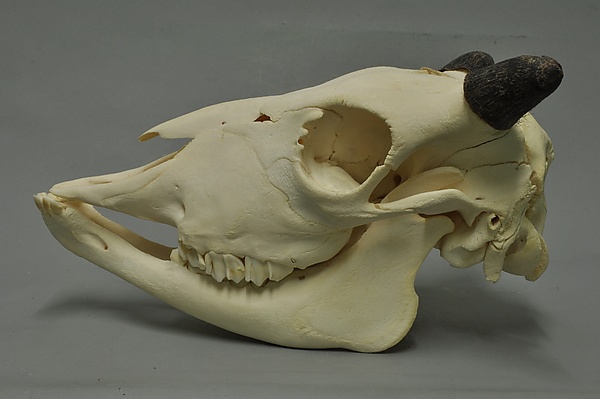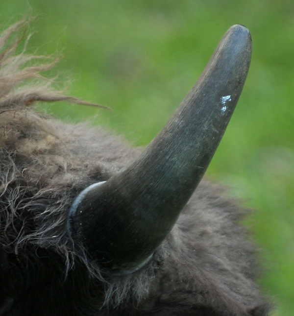 Голова животного расположена настолько низко, что основание хвоста всегда располагается выше темени. Лоб широкий, выпуклый, а морда, напротив, относительно небольшого размера[51]. Расположенные в теменной области широко расставленные и выдающиеся вперёд рога, по отношению к величине зверя и массивности головы, не велики. Их изгибы направлены в стороны, а расстояние между их кончиками больше, чем между основаниями[52]. Широкие в основании, они суживаются к концам, при этом у коров они тоньше, короче и более изогнуты. Они чёрного цвета, имеют гладкую, полированную поверхность, полую и круглую в разрезе форму на всём протяжении. На протяжении жизни они не меняются, однако у старых животных, как правило, рога затуплены или частично сбиты[53][54]. Длина рогов по внешнему изгибу доходит до 65 см, развал — до 78 см[55]. Уши короткие, широкие, покрыты шерстью и в значительной степени скрыты в густых волосах на голове[56].