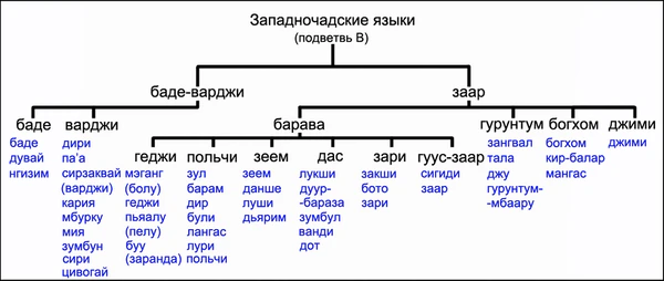 В классификациях афразийских языков чешского лингвиста В. Блажека и британского лингвиста Р. Бленча предлагаются иные варианты состава и родства языков подгруппы заар (барава) и иная точка зрения на место этой подгруппы в рамках западночадской ветви языков. Так, в классификации В. Блажека кластер польчи отнесён к подгруппе языков заар, в которой представлены языки и кластеры заар (сайа), дасс, зеем и геджи. Подгруппа заар вместе с подгруппами богхом (боггом) и гурунтум в данной классификации являются частью группы южные баучи, которой противопоставлена группа, объединяющая языки северные баучи и баде-нгизим[20]. В классификации Р. Бленча, схожей с классификацией В. Блажека (с отличиями в основном в терминологии), кластер польчи вместе с кластерами геджи, зеем, дас, зари и гуус-заар образуют подгруппу барава (у В. Блажека — заар), противопоставленную подгруппам гурунтум, богхом (боггом) и языку джими в рамках группы заар (у В. Блажека — южные баучи). Группа заар и группа баде-варджи с подгруппами баде и варджи (у В. Блажека — северные баучи и баде-нгизим), в свою очередь, формируют подветвь западночадских языков B[3][5][14].