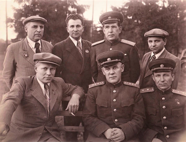 Лауреаты Сталинской премии ЦАКБ: В. ГРАБИН, И. ИВАНОВ Д. ШЕФФЕР, П. НАЗАРОВ, М. РОЗЕНБЕРГ, К. РЕННЕ, П. МУРАВЬЁВ, Е. СИНИЛЬЩИКОВ, В. МЕЩАНИНОВ