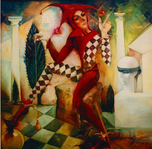 Шут в шляпе с колокольчиками. Душа, погружённая в мир собственных фантазий и переживаний. Картина Сергея Иванова называется «Размышления». Каждая деталь на полотне кажется, с одной стороны, случайной, а с другой — оправданной внутренней логикой картины. Глаза скульптурной головы позади шута, завязанные чёрной лентой показывают, что душе не нужны глаза, чтобы видеть. Смещённые углы странной формы комнаты, смещённый пол в виде шахматного поля показывают, что душа живёт в собственном мире, где не действуют законы трёхмерного пространства. В хрустальном шаре под ногой шута не отражается будущее: душа сама знает всё наперёд.