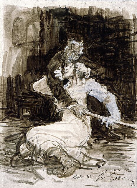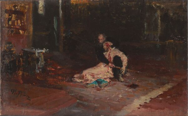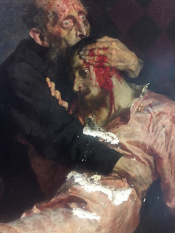 Меня охватило чувство совершенного удовлетворения за Репина. Вот она, вещь, в уровень таланту… И как написано, Боже, как написано!… Что такое убийство, совершенное зверем и психопатом?.. Отец ударил своего сына жезлом в висок! Минута… В ужасе закричал… схватил его, присел на пол, приподнял его… зажал одной рукою рану на виске (а кровь так и хлещет между щелей пальцев)… а сам орет… Этот зверь, воющий от ужаса… Что за дело, что в картине на полу уже целая лужа крови на том месте, куда упал на пол сын виском… Эта сцена действительно полна сумрака и какого-то натурального трагизма…