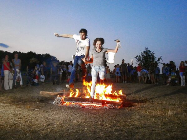 На Украине и в Белоруссии девушки и парни, взявшись за руки, прыгали попарно через огонь. Если во время прыжка их руки останутся вместе, то считали, что это явная примета их будущего брака[67]; то же, если вслед им полетят искры[68]. Для защиты от колдовства в Гомельской губернии парни на руках качали девушек над купальским костром[69]. Молодёжь и дети, прыгали через костры, устраивали шумные весёлые игры: бегали наперегонки и играли в горелки[70].