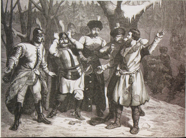 Тут, в деревне Вишенце, мы поймали старого крестьянина и взяли его проводником, чтобы не заблудиться и не набресть на Волок, где стоял сильный неприятель. Он вел нас в одной миле от Волока, ночью же нарочно повернул к тому месту. Уже мы были от него в одной только версте. К счастью попался нам Руцкий, который в то время, проводив товарищей, вышедших из столицы к пану гетману, возвращался под самыми стенами Волока на свои квартиры в Рузу, где стоял с казацкою ротою. От него узнали мы, что сами идем в руки неприятелю, и поспешили воротиться. Проводнику отсекли голову, но страха нашего никто не возвратит[10].