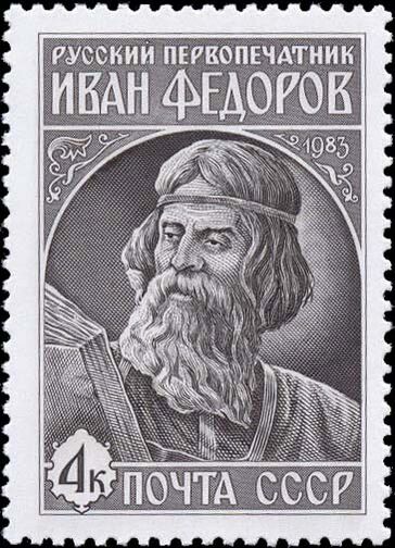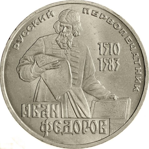 - В 1983 году мировая общественность широко отмечала 400-летие со дня смерти Ивана Фёдорова. К этому событию в СССР был выпущен юбилейный медно-никелевый рубль. Диаметр — 31 мм, масса — 12,8 г. Гурт: две надписи «ОДИН РУБЛЬ», разделённые двумя точками. Выпуск 03.01.1984 г. Авторы: эскизов — Крылов, моделей — С. М. Иванов. Тираж: 3 000 000. ЛМД.