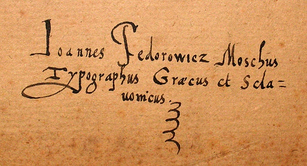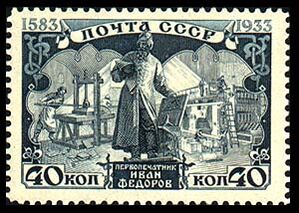 По традиции, часто называется «первым русским книгопечатником»[6]. Иван Фёдоров — издатель первой точно датированной печатной книги «Апостол» в Русском царстве, а также основатель Острожской типографии в Русском воеводстве Речи Посполитой.