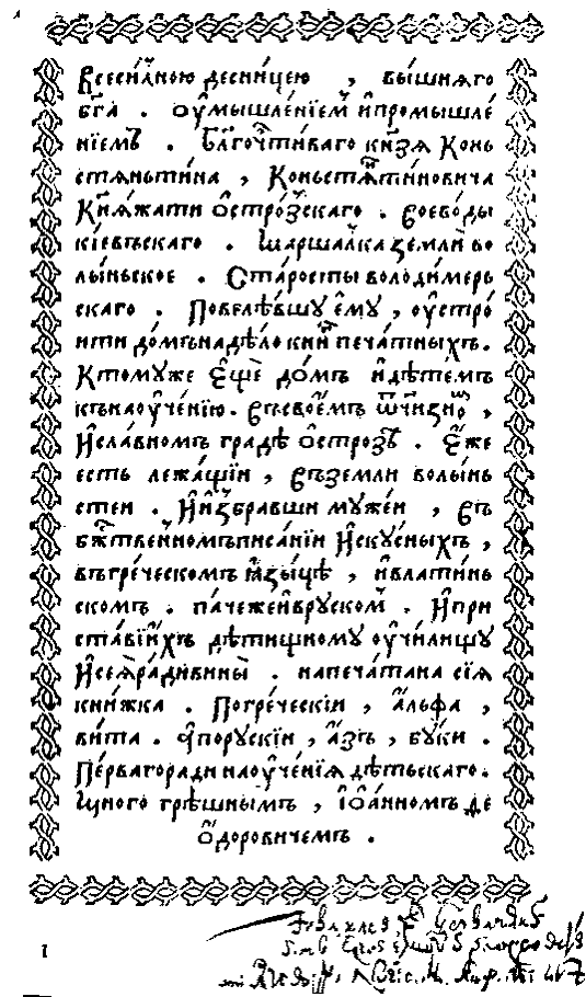 9. Букварь. Острог, 1578, 48 ненумерованных листов, полоса набора 127,5 x 63 мм, печать в один цвет, тираж был большим, но сохранилось лишь два неполных экземпляра (об одном уже говорилось, второй же хранится в Королевской библиотеке Копенгагена). Повторение львовского букваря 1574 года с добавленным «Словом о буквах» Черноризца Храбра. Имеется электронная версия этой книги и предыдущей.