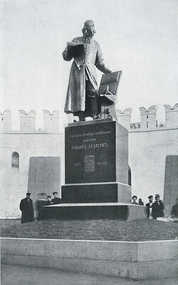 - В 1909 году в Москве у Китайгородской стены, напротив Синодальной типографии (древнего Печатного двора), был установлен памятник Ивану Фёдорову работы скульптора С. М. Волнухина. Изображения Ивана Фёдорова неизвестны, нет даже его словесного портрета. Волнухин совместно с художником С. В. Ивановым и историком И. Е. Забелиным создали обобщённый образ, этот образ и отражён в памятнике.
