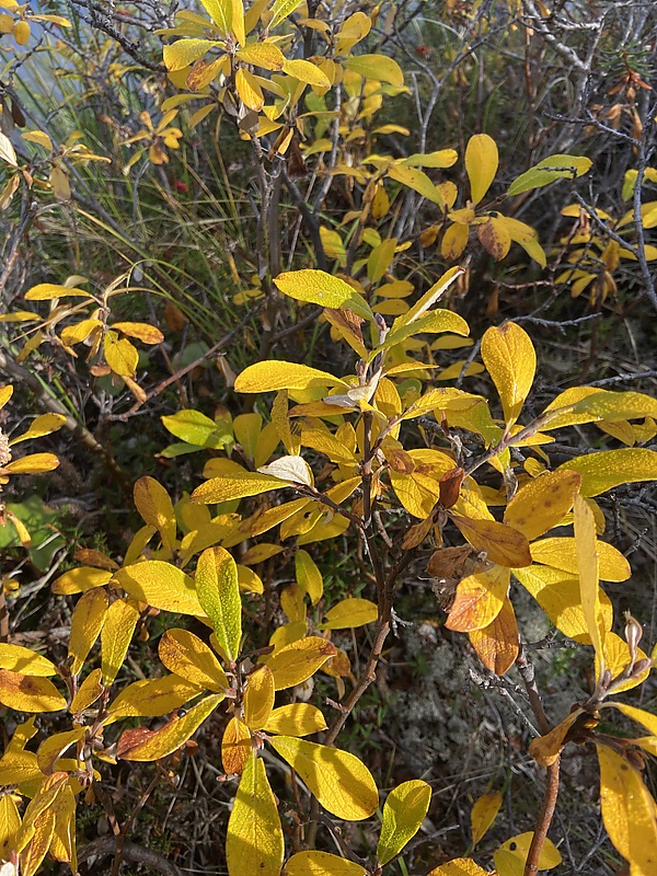 Низкий кустарник 40—150 см высотой с красновато-тёмно-бурыми, голыми и глянцевитыми годовалыми ветвями и пушистыми молодыми. Листья эллиптические, удлинённо-эллиптические или продолговато-обратнояйцевидные, обыкновенно коротко-заострённые, с косым и вдоль сложенным заострением, цельнокрайные, с немного завороченными на нижнюю сторону краями, при основании широко-клиновидные, редко закруглённые, 2—8 см длиной и 1—3 см шириной, в 2—3 раза длиннее своей ширины; снизу более или менее густо покрыты короткими тонкими курчавыми отстоящими волосками (кроме того иногда, преимущественно молодые, по жилкам — с более длинными, прямыми) и оттого густо беловойлочные, или же взрослые — сероватые от более рыхлого и тонкого войлочка; на верхней стороне они серовато-зелёные, негусто опушённые или почти гладкие, зелёные. Черешки 3—7 мм длиной; прилистники наблюдаются довольно часто, преимущественно на более сильных побегах, косо-яйцевидные или яйцевидно-ланцетовидные, равные или в 2—3 раза короче черешка.