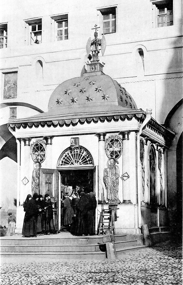 В 1669 году копию принесенного с Афона списка Иверской иконы поместили при триумфальных Неглиненских (Воскресенских) воротах Китай-города. Для иконы был сделан небольшой деревянный навес, позднее вместо него воздвигли часовню[15]. В 1791 году часовню перестроил архитектор Матвей Казаков[16]. После разорения 1812 года восстановлена как памятник победы над Наполеоном[15].