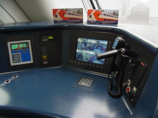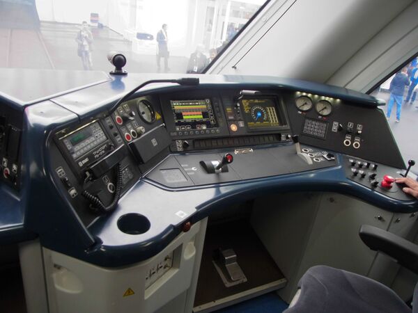 Наклонная панель мониторинга перед машинистом состоит из трёх наклонных плоскостей, при этом крайние плоскости расположены под углом к центральной. С левой стороны на пульте машиниста имеется радиостанция с трубкой, телескопический микрофон, переключатель токоприёмника и несколько кнопок, включая кнопки включения и отключения быстродействующего выключателя, замок для ключа включения пульта и стрелочный вольтметр входного напряжения в контактной сети. По центру располагаются два цветных жидкокристаллических дисплея: слева — многофункциональный дисплей бортового компьютера с функциональными клавишами снизу и справа, на котором выводится информация о состоянии всех систем поезда, а справа — дисплей безопасного объединённого локомотивного комплекса (БЛОК), на котором отображается виртуальный стрелочный спидометр и данные о маршруте[59].