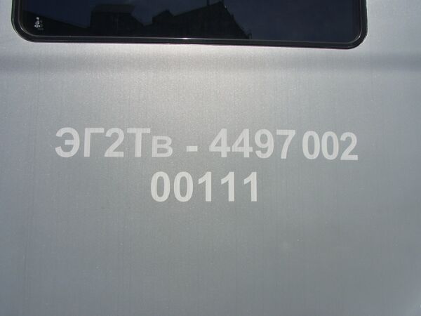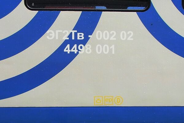 Маркировка поезда наносится на лобовой части головного вагона по бокам от крышки обтекателя и содержит обозначение серии поезда ЭГ2Тв и его номер симметрично относительно автосцепки. При этом у поезда 001, после перекраски в цвета бренда «Московский транспорт», порядок нанесения отличается от применённого на поезде 002: последний имеет классический порядок (слева обозначение, справа номер), а для первого состава порядок обратный. Также у первых двух составов их номера без обозначения серии наносятся на головных вагонах сбоку между дверью и окном кабины машиниста возле камер заднего вида. У поездов «Иволга-1.0» порядок расположения обозначения серии и номера на лобовой части также классический, но боковая маркировка с обозначением номера состава отсутствует. У первого поезда версии «Иволга-2.0» (№ 027) на заводе изначально порядок нанесения серии и номера был обратным, при этом состав получил номер 001, поскольку на тот момент ещё не был решён вопрос об обозначении серии для новой версии поезда[28].